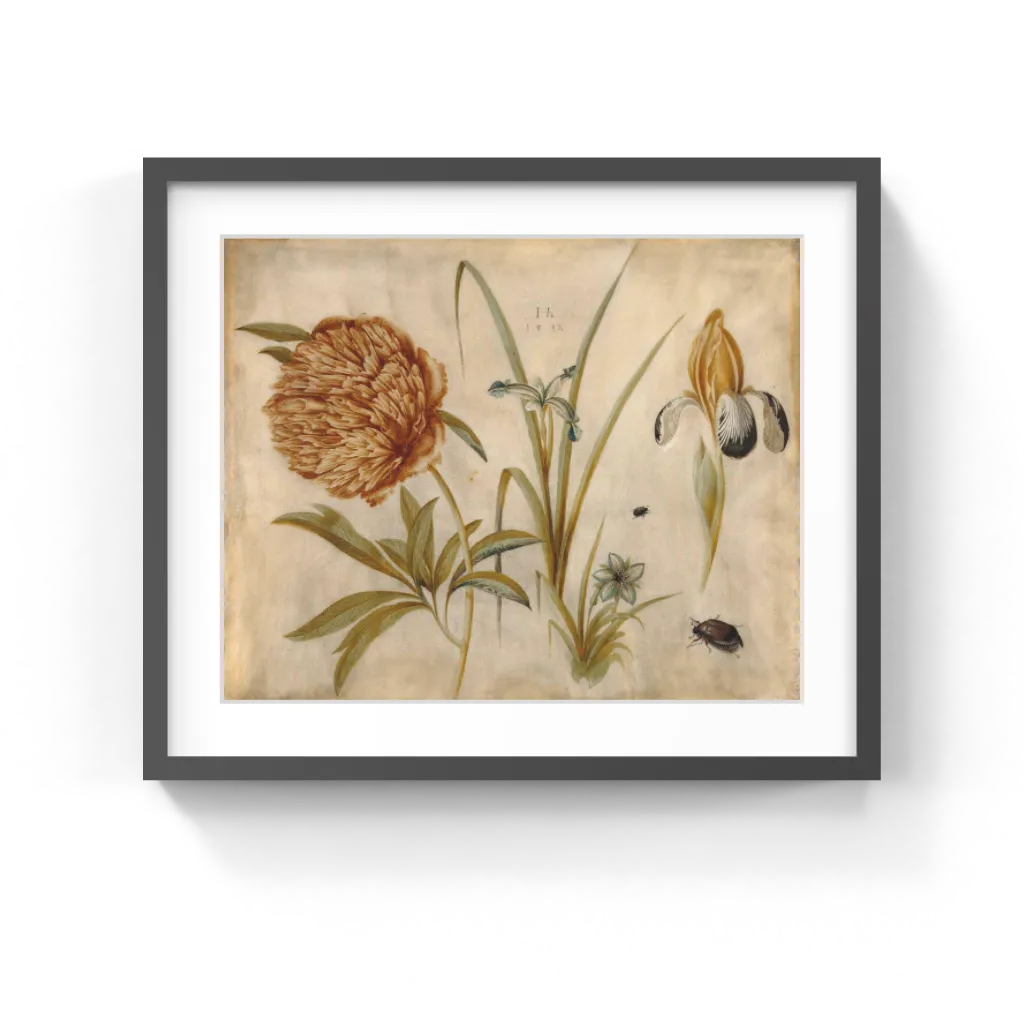 Hans Hoffmann (German, about 1530–1591/1592) In the late 1400s, northern European artists began to study and draw plants and animals with a greater interest in accuracy. Although showing the uniqueness of each of these specimens was undoubtedly important to Hans Hoffmann, he equally tried to portray the individual beauty of each flower and insect. He placed the peony, two species of irises, an amaryllis, a may beetle, and a june bug in an attractive arrangement on the page. He drew the delicate forms carefully and added lush color in a palette of green, blue, and red. He used plain black chalk to represent the shadow cast by the beetle's body, illusionistically raising the beetle's legs off the ground with this trompe-l'oeil effect.
