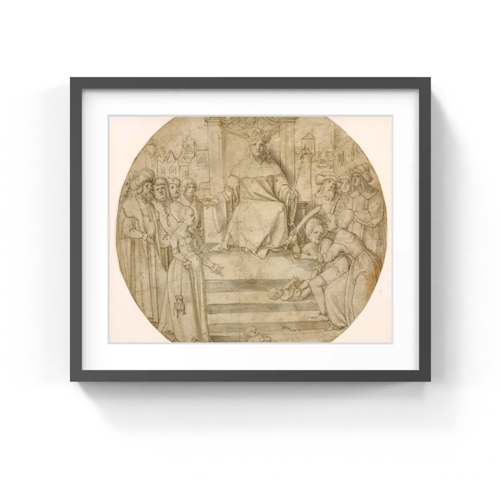 Hans von Kulmbach (German, about 1480–1522) An executioner holds his sword aloft, ready to slice the baby, while one woman frantically grabs his arm, begging him to stop. Hans von Kulmbach showed the dramatic climax of the story in which the wise King Solomon was asked to judge between the claims of two women who had each given birth to a child at the same time. When one of the babies died, both women demanded the remaining infant. To determine the truth, Solomon ordered his guards to cut the living child in half and give a portion to each. The real mother then rushed forward to prevent the act, so that her child might be spared. Onlookers with beards and exotic headgear, looking much like Renaissance European Jews, observe the scene, while the other mother points to her dead child lying at the foot of the stairs.