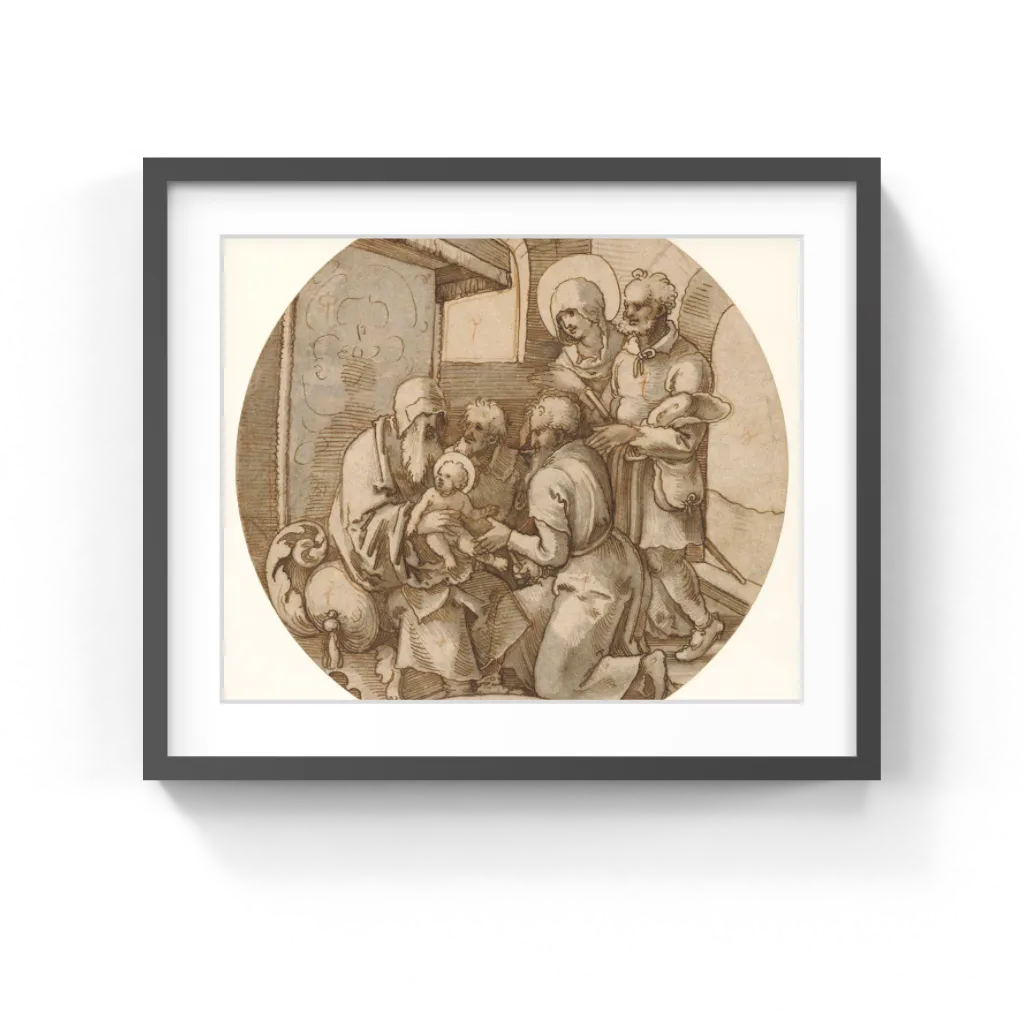 Sebald Beham (German, 1500–1550) The Virgin Mary and Joseph watch with clasped hands as a priest prepares to circumcise their son, the infant Jesus. The drawing's simplified linear style appropriately renders their air of homespun piety. Sebald Beham relied upon simple, bold outlines and hatching to describe the scene, since few details would be visible once the scene was set high in a church window.
