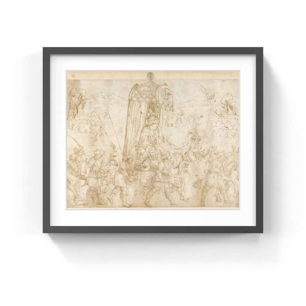 Erhard Schön (German, about 1491–1542) Organized into a frieze, Süleyman the Magnificent's stately procession travels from left to right. The sultan sits under a canopy, surrounded by turbaned followers and two horses carrying the palanquin. The pennants, the front of the canopy, and its crest prominently display the crescent moon, symbol of the Ottoman Empire. The relatively empty background shows more of the Sultan's followers leading camels and a church and fortified building burning quickly.