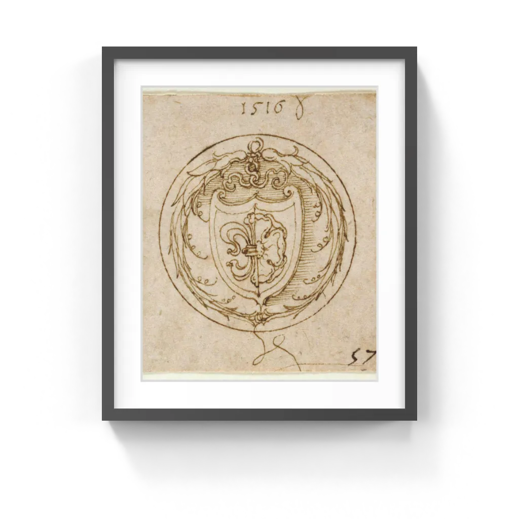 Albrecht Dürer (German, 1471–1528) Scholars do not know the object for which this small circular design containing a coat of arms surrounded by two branches was actually used; suggestions have ranged from a signet ring to a bookplate. The coat of arms contains a demi-fleur-de-lis at the left and a demi-rose at the right; these might have belonged either to Matthaeus Lang von Wellenburg, cardinal of Salzburg, or to the Nuremburg humanist and lawyer Lazarus Spengler. As both the arms of these men reversed the position of the rose and fleur-de-lis, Albrecht Dürer could have made this design for an engraving. The trimmed flourish at the top of the sheet shows that someone cut the image from a larger sheet.