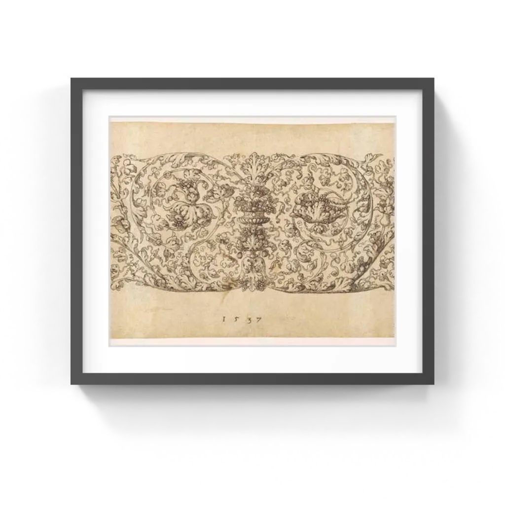 Although both sides of the drawing have been cut off, leaving only the edge of an urn on the right, Solis probably intended to show the beginning of the same repeating pattern. Other artists and craftsmen could then have copied this continuous decorative frieze to ornament a panel on a variety of objects. The horizontal incised lines above and below the design could have been used to transfer the image onto another surface.