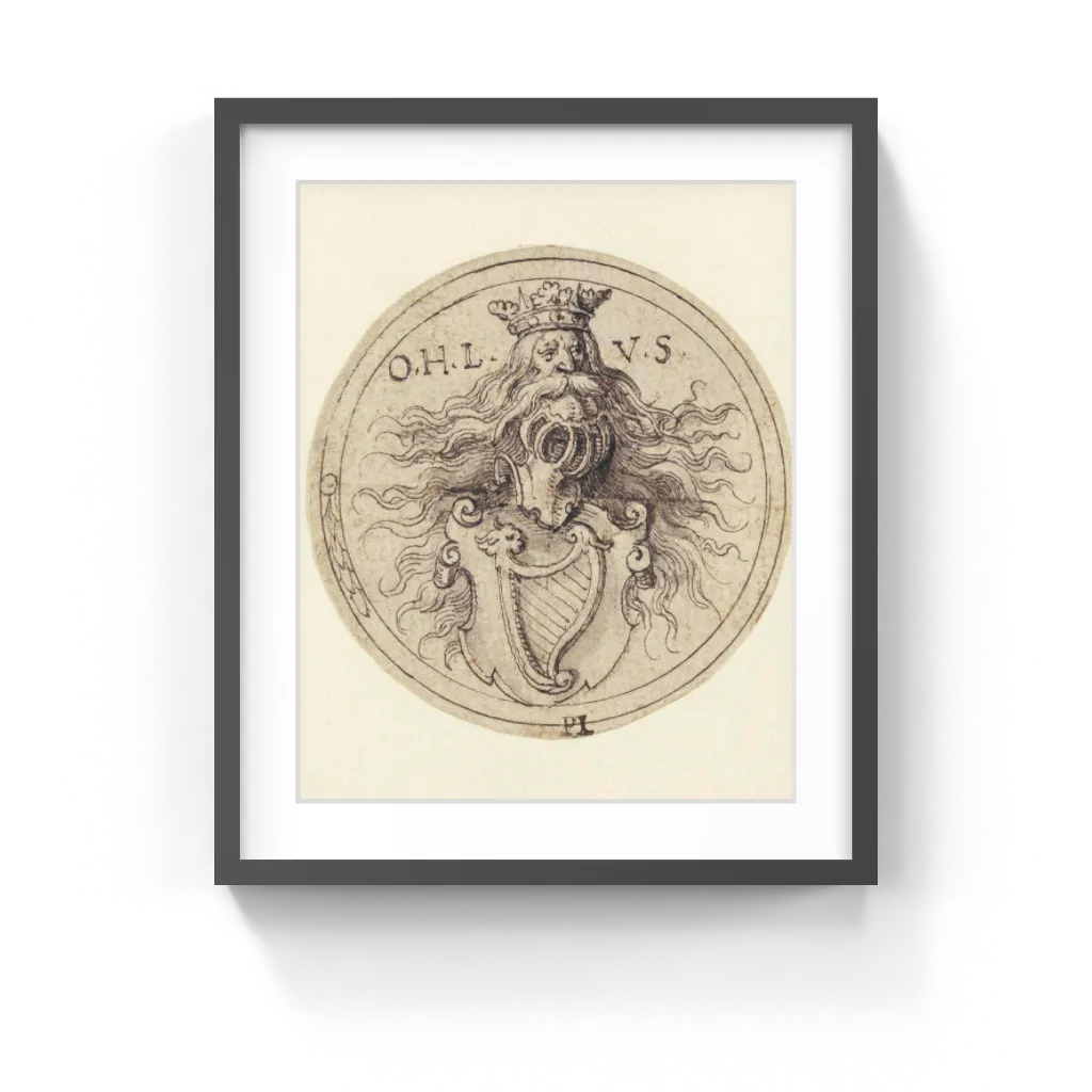 Virgil Solis (German, 1514–1562) The harp on the shield of the coat of arms indicates that the elderly king with flowing locks and beard on top of a helmet is the biblical King David. The abbreviation O.H.L.might refer to a family name or a motto, while the V.S.was one of several monograms used by the artist Virgil Solis. Scholars do not know the exact purpose of this design, but they believe it may have been made for a bookplate or an etching on glass.