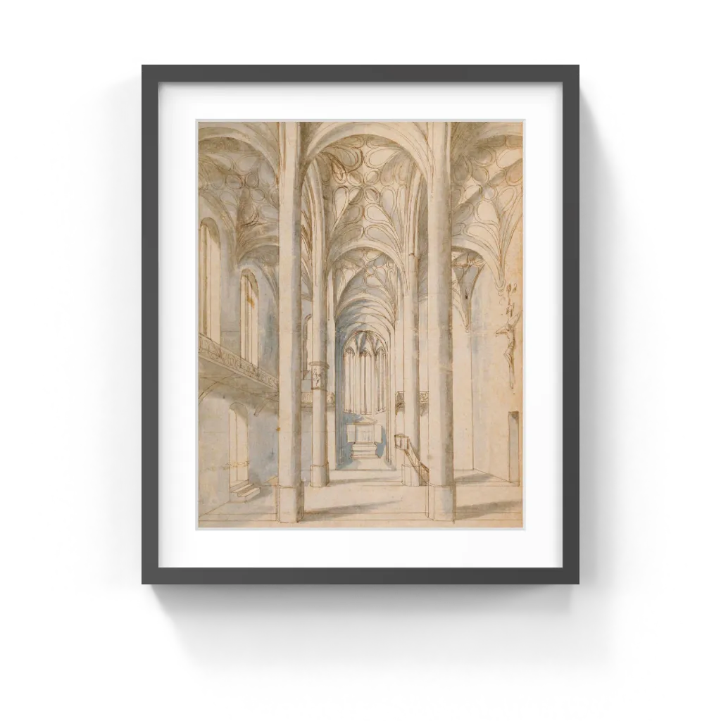 Paul Juvenal the Elder (German, 1579–1643) Paul Juvenal the Elder based this architectural vista on the Augustinian Church in Nuremberg, which was torn down in 1819. Large portions of the paper are left blank, which gives the architecture a sense of spaciousness suffused with light. Use of a thin-nibbed, sparsely inked pen, briefly sketched ornament, lack of figures, and fine, ruled lines further emphasize the building's verticality and space. Blue wash--more luminous and airy than the common brown wash--increases the soaring effect of the vaults and the interior's sunlit feeling. The color's decorative quality also complements the delicacy of the "fish bubble" vaulting.