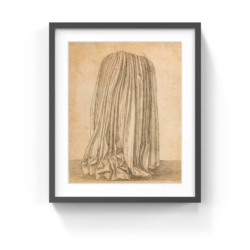 Brosamer's practice of drawing objects from life and his use of contemporary clothing as subject matter show that he was abreast of the artistic trends of his own period. At the same time, his tendency to treat individual pieces of drapery as self-contained outlined forms illustrates his delight in the complex folds of cloth alone. In a closely hatched style, Brosamer detailed not only the intricate pleated effect of the folds but also the bunching pattern as it hits the ground.
