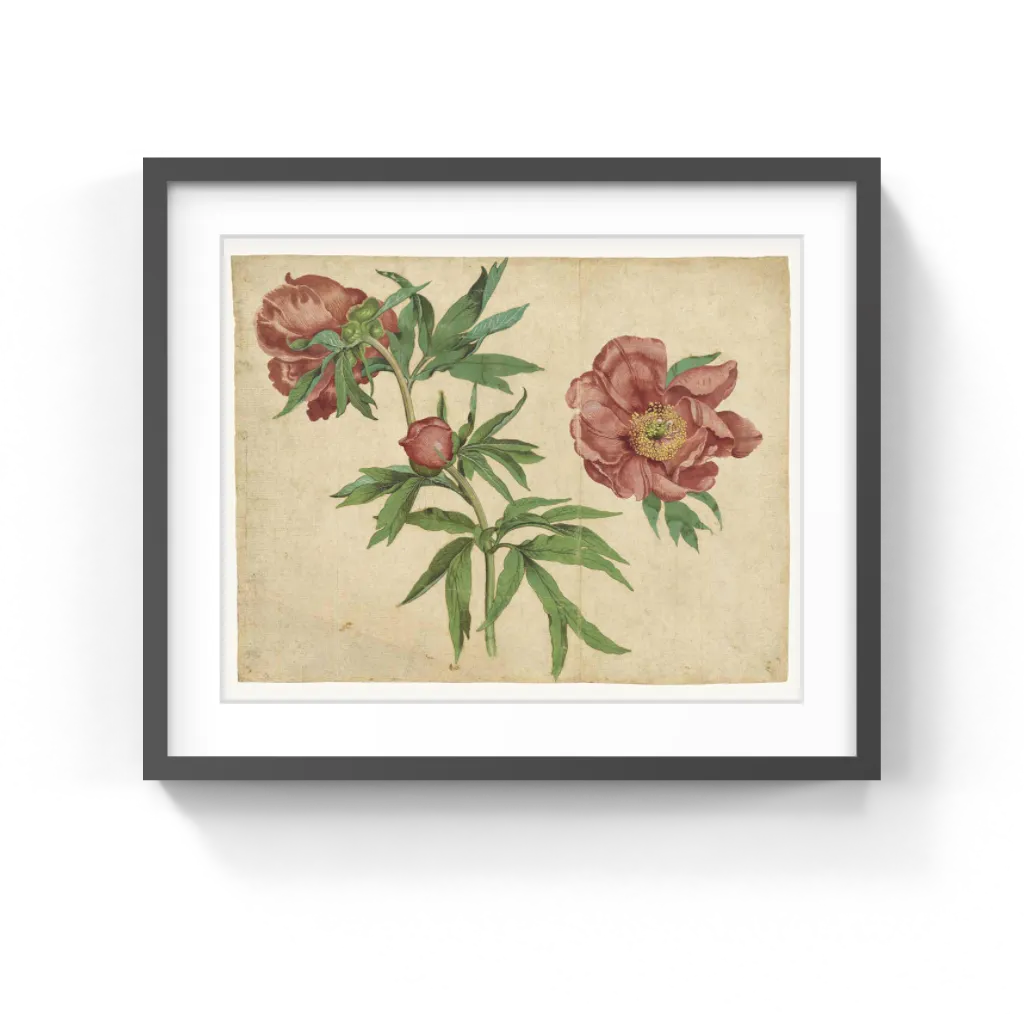 Martin Schongauer (German, about 1450/1453–1491) One of the earliest surviving northern European botanical studies drawn from life, this drawing shows a fully opened peony bloom, viewed first from the front and then from the back, and one bud. Martin Schongauer achieved subtly gradated coloration by laying in the basic forms in a broad painterly wash and then describing the details in bodycolor, opaque water-based color, with the point of the brush. Though an outstanding example of a highly finished drawing, it was made as a study for the painting, The Madonna of the Rose Garden of 1473, in the Dominican church in Colmar.