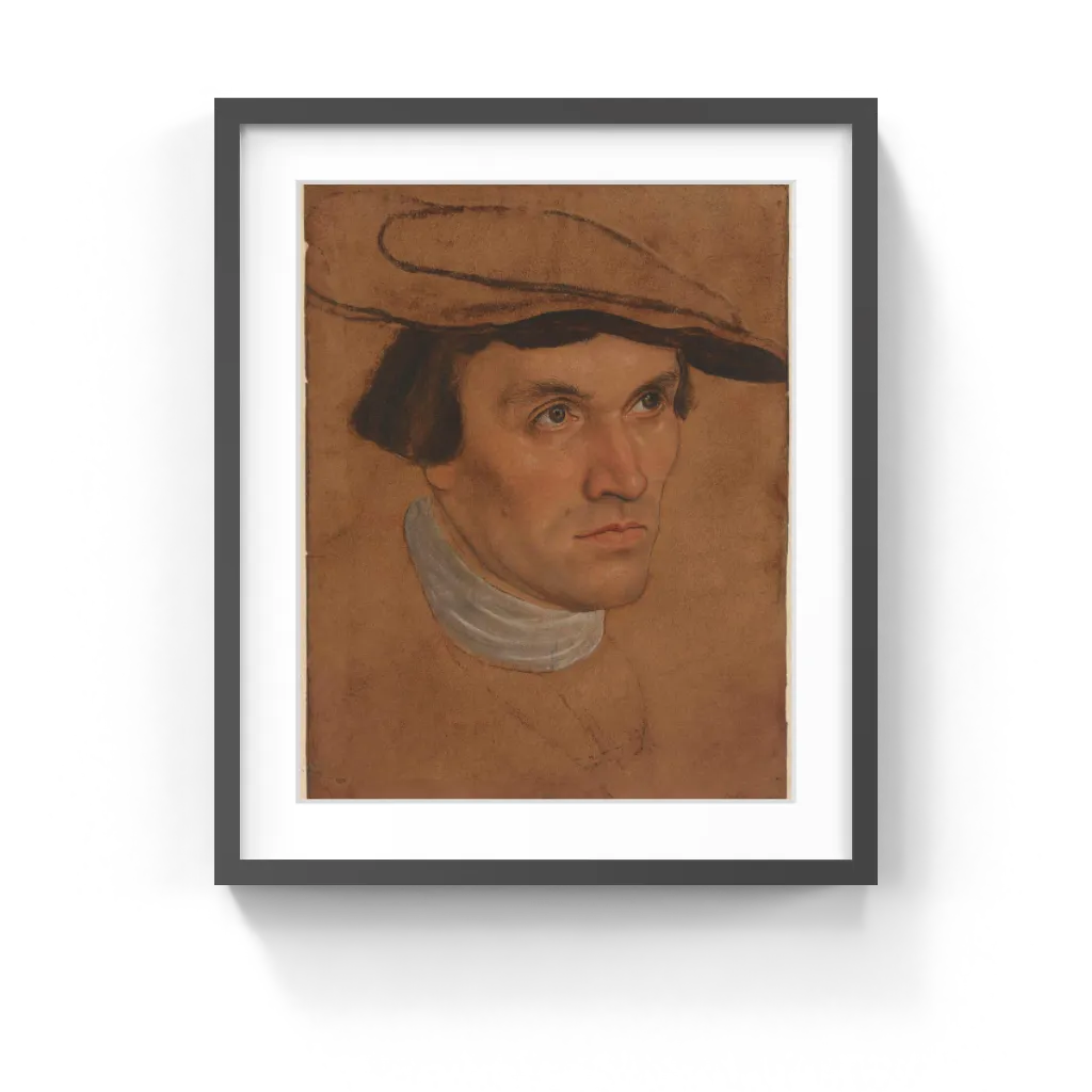 To produce the brownish ground, Cranach rubbed the paper with oil. He then sketched in the outlines of the head in pen and ink, meticulously going over the eyebrows, lashes, and outer facial contours. Next, using black chalk and brown oil paint, he sketched in the hat and collar. He continued by working up the face in oil paint, meticulously establishing the nuanced contours of the man's facial structure.
