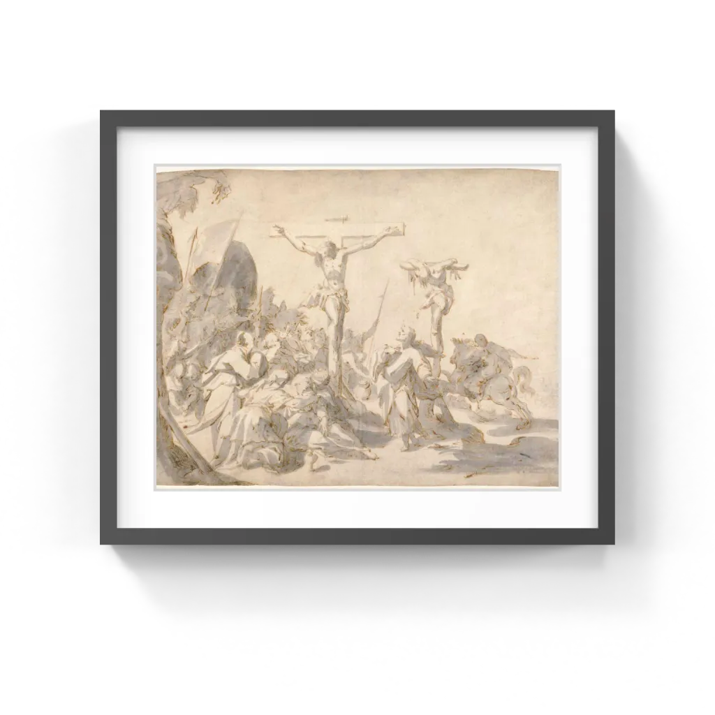 Hans von Aachen (German, 1552–1615) A diagonal line follows the diminishing figures, from the looming body of the good thief at the extreme left edge, to Christ hanging on the cross in the center, to the bad thief at the right, and finally down toward Jerusalem, lightly sketched in the distance. A tumultuous group of figures and horses crowds around the feet of Jesus at the left, with rearing horses, the Virgin weeping, and Saint John pointing at himself; but the top left of the composition remains open. With such techniques, Hans von Aachen created an effect of dramatic spaciousness.