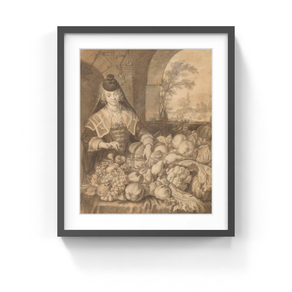 Joachim von Sandrart (German, 1606–1688) A fashionably dressed woman personifying September visits a market and chooses some figs from among the abundant fruits and vegetables displayed on a table. A scale hangs on the wall behind, while through an archway hunters shoot a herd of deer in a distant landscape. Joachim von Sandrart executed the drawing in a richly handled combination of chalk and wash, which evokes the range of textures of an oil painting, from the transparent layers of the woman's toile collar to the varied textures of the produce.