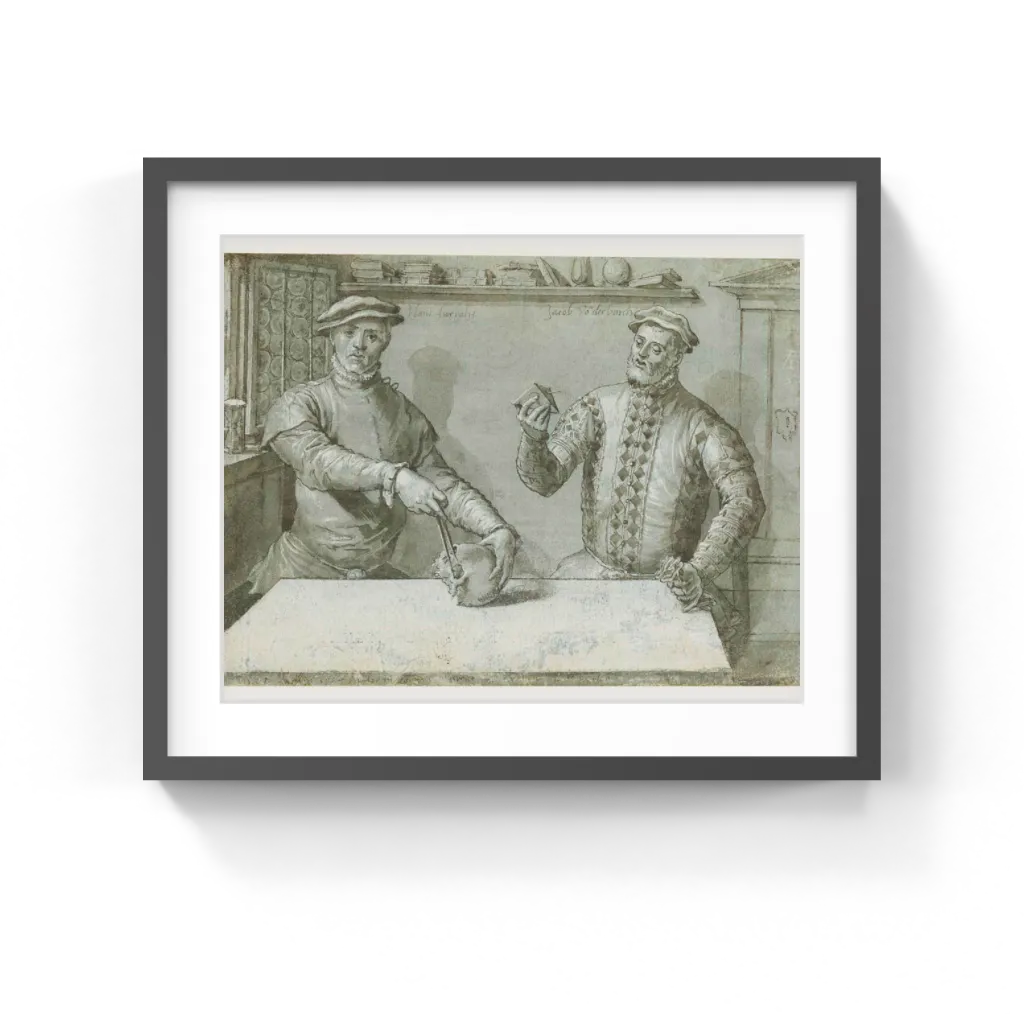 Attributed to Ludger Tom Ring the Younger (German, 1522–1584) At a table beside an open window, two men sit for their portrait. Stacked books, a vase, and a globe line the shelf above their heads, while an hourglass sits on the windowsill. Scholars know nothing about Hans Furraht on the left or Jacob von der Burch on the right, apart from their names, which are inscribed by their heads. Both wear the costumes of fashionable, middle-class burghers, with tight-fitting padded jackets and a soft, low bonnet on their heads for warmth. Hans, shown measuring a skull, may have been a doctor or anatomist; he wears somber clothing decorated only with a ruff around his neck. Jacob, who studies a stereometric form, was probably a mathematician and wears a more ornate checkered jacket with slashed sleeves.