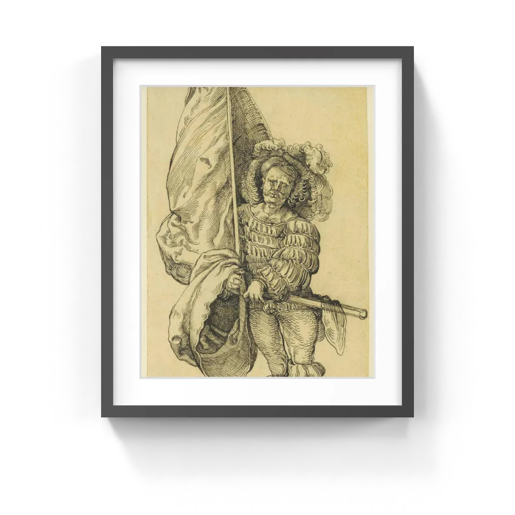 Sebald Beham (German, 1500–1550) Hans Sebald Beham chose an unusual pose for his standard bearer. Artists typically portrayed such figures in motion, striding forward with a flag fully unfurled, but Beham chose a static, frontal composition instead. The standard bearer strikes a classical contrapposto pose to balance the visual and actual weight of the massive flag, drawn with delicate penmanship.