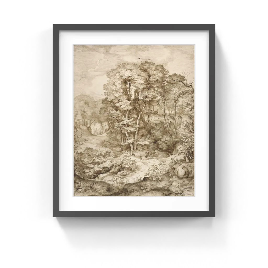 With a fine-nibbed pen and a virtuoso technique, Gärtner painstakingly differentiated species while creating an ornamental forest of dense yet delicate layers of plants. But he portrayed more than plants: his diminutive humans express a contemplative spirituality in which humanity is both immersed in and one with nature. The shepherd tending his flock and the religious procession approaching a chapel with a graveyard also allude to earlier religions, both pagan and medieval. In a manner reminiscent of Caspar David Friedrich, whose Christian art was similarly based in nature, the forest is hushed and waiting.