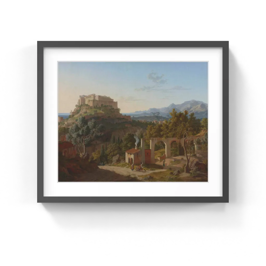 foreground is carefully described. Leo von Klenze, who is primarily known as the chief architect and head of public works in Munich, was also an accomplished painter. Combining his talent for keen observation with an ability to improve upon nature, Klenze amended this vista of the Italian town by altering the castle's architecture, inserting a Roman aqueduct, and changing the location of the olive trees.