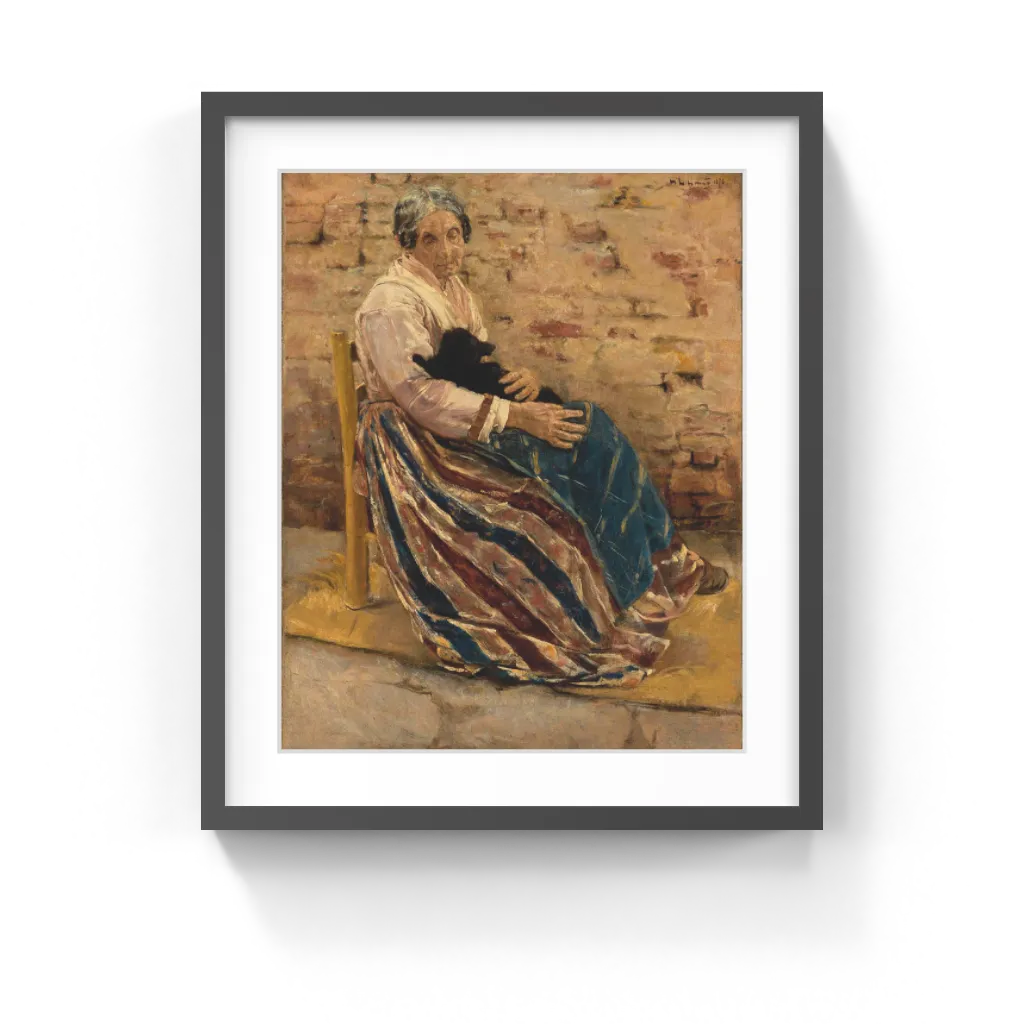 Influenced by the Dutch Masters of the 1600s, Liebermann became fascinated with themes that concerned contemplative states. He also absorbed the lessons of French painters; his richly worked execution of this painting reflects the painterly style he learned in Paris in the 1870s. An Old Woman with Cat was painted in 1878 in Venice, where Liebermann went to recuperate after breaking his leg. He captured that city's famous golden light to harmonize the rich and disparate colors and textures of the woman and the setting.