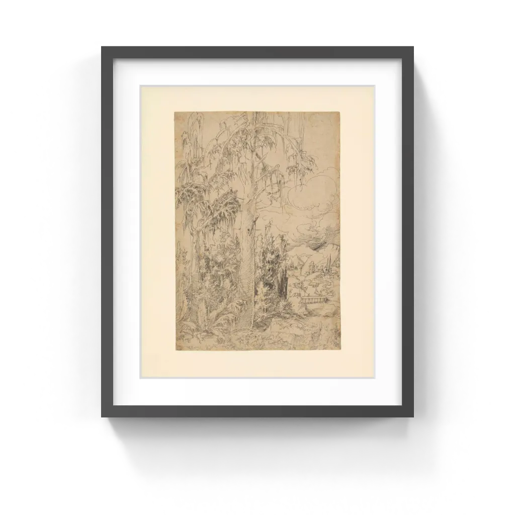 Unknown maker, Danube School, active 1500 - 1525 This dynamic depiction of soaring pine trees with their dripping tendrils together with the panoramic river scene is a fine example of pure landscape drawing. The trees tower above the modest signs of human habitation signaled by the tiny bridge and church in the distant background.