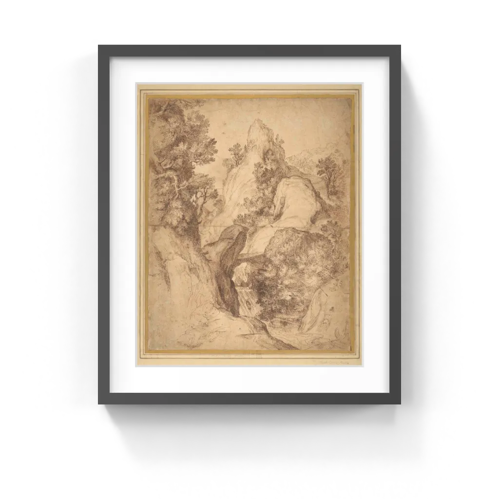Girolamo Muziano (Italian, 1528–1592) Girolamo Muziano used a number of devices to weave together the elements of this mountain landscape. A protruding rock extends from the left across the stream, leading the eye across the bridge and along a ridge on the far bank and on to a craggy peak in the distance. The small stream descending in a waterfall provides another compositional axis. Muziano used the paper's blank areas to provide his brightest highlights and further capture the viewer's attention.