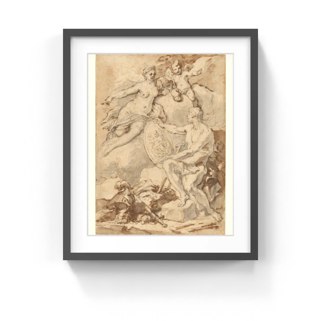 Francesco Solimena (Italian, 1657–1747) The goddess of love, Venus, asked her husband, Vulcan, to make a set of armor for Aeneas, her son, when he was about to go to war. Here, Vulcan shows off the richly decorated shield he has made, as Venus and Cupid hover above him on a cloud. He gestures to the helmet and sword that lie at his feet.