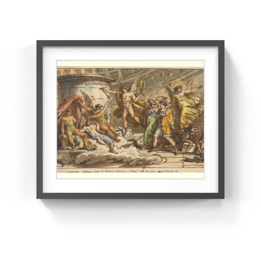 Minerva, the goddess of Wisdom, leads Canova toward the cylindrical structure, while the winged figure of Fame, holding a trumpet, tries to crown him with a laurel wreath. In the center, Victory inscribes Canova's name on the monument for two of the most renowned sculptors of Greek