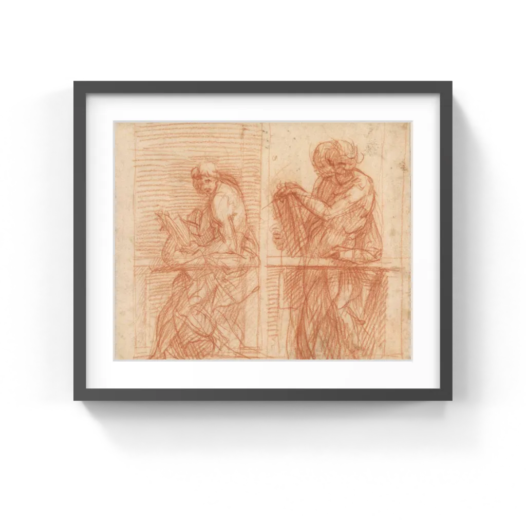 With quick, sure strokes of his red chalk, del Sarto experimented with a variety of complex arrangements for each figure's body, sometimes including drapery and always crossing limbs and turning heads. He overlaid numerous ideas for each figure, quickly trying one thought, then modifying it for the next. Beyond giving the figures balance, he aimed to make them look natural and relaxed. With the railing both standing in front of and bisecting the figures, the artist also had to work out how to maintain unity between the upper and lower halves of each figure. The many artistic solutions evident in this study give a glimpse of his fertile and creative mind.