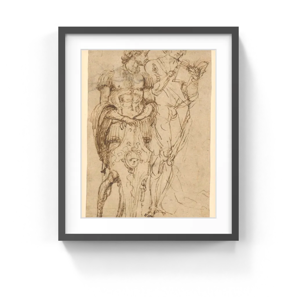 Attributed to Andrea Mantegna (Italian, about 1431–1506) Two male figures stand in a relaxed, classical contrapposto pose, with each one's body weight resting on one leg. The figure on the left steadies a large shield decorated with a Medusa-like head and looks to the side, apparently gazing at the book being read by his companion.