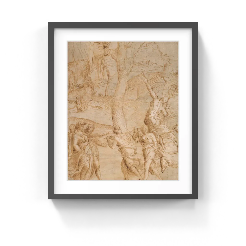 Unknown maker, Central Italian School This receding composition shows an artist carefully combining landscape and figures and maintaining points of interest even in the distance. The unknown draftsman used hatching and cross-hatching to create form, shadow, and movement, showing his concern with arranging light and shadow. Through the sketchy, expressive pen work in the background, he achieved an effect of spontaneity.