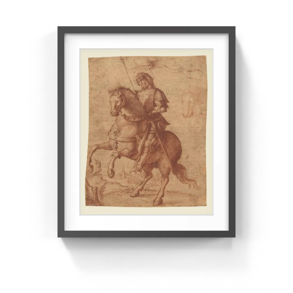 Circle of Giovanni Battista Cima da Conegliano (Italian (Venetian), about 1459/1460 ?–1517/1518) In this drawing the artist focused on expressing light's ability to shape form. The horse's three-dimensionality and the haloed saint's armor are rendered in a wide range from light to dark, resulting in the effect of rounded, physical forms. In some areas, work began with stylus underdrawing, which the artist then drew over and elaborated on with red chalk.