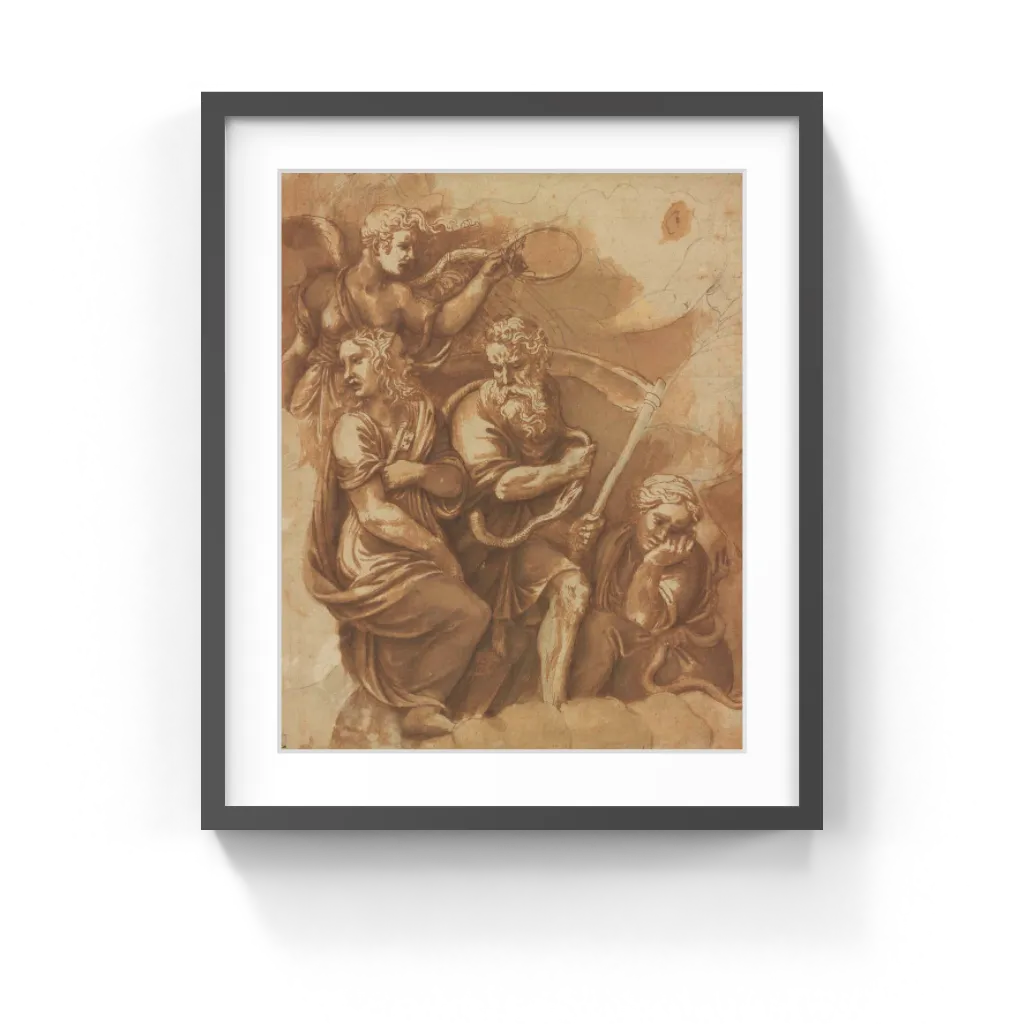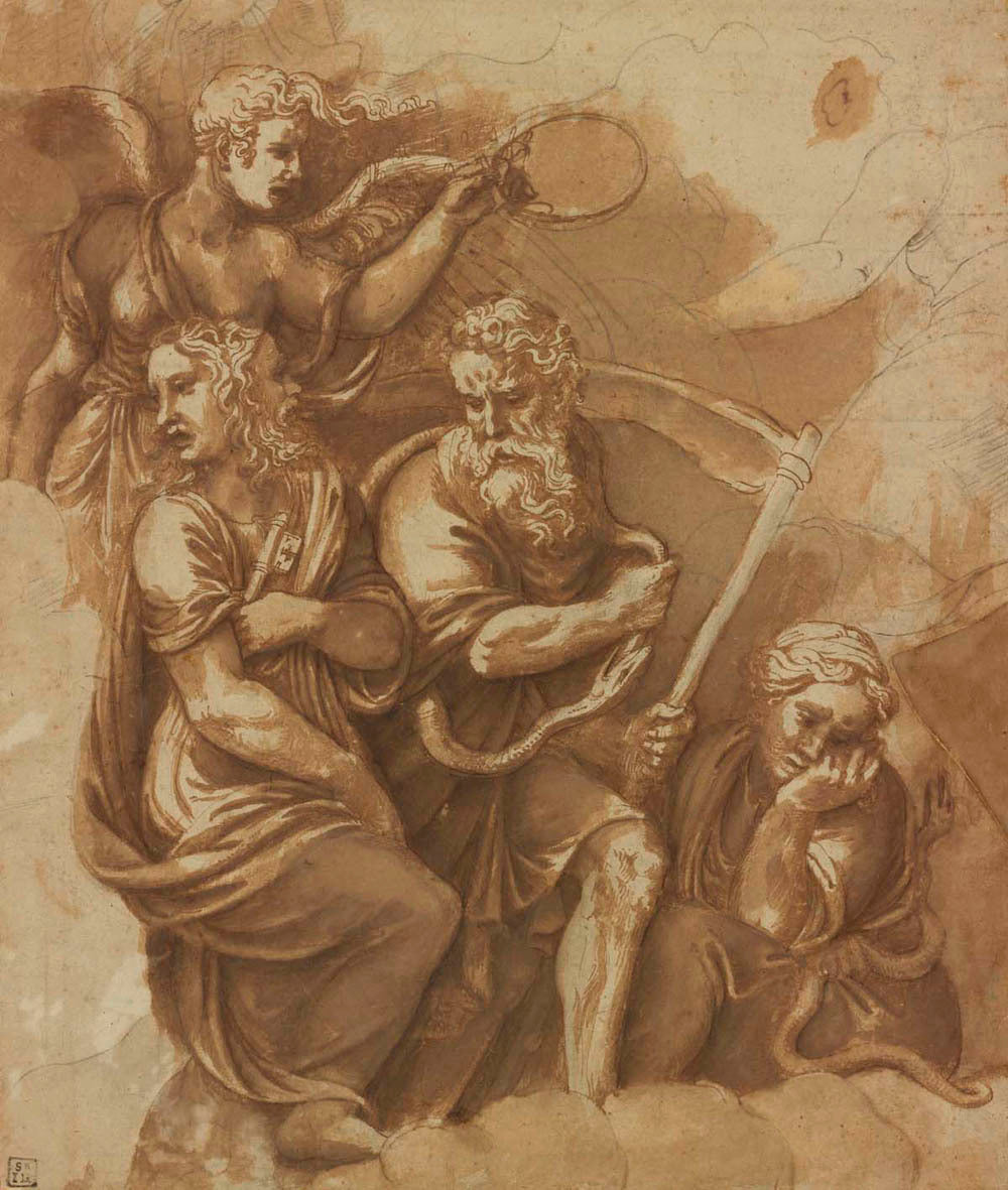 Giulio Romano (Giulio Pippi) (Italian, before 1499–1546) Two Roman gods and a goddess, accompanied by a Victory, peer down from the edge of a bank of clouds. On the left, holding a large key, is Janus, the guardian of the doorways of houses and city gates. He is traditionally portrayed with two faces, demonstrating his ability to look both ways at once. In the center, the bearded figure of Chronos personifies Time. In one hand he holds a scythe, while a snake gripping its tail in its mouth wraps itself around his neck. Such a snake holding its tail was an ancient Egyptian symbol of eternity. Gaea, the goddess of the Earth, crouches at Chronos's feet with another snake grasped in her right hand. The winged figure of Victory, her hair streaming out to the side, stands behind these three and holds out a crown in her left hand.