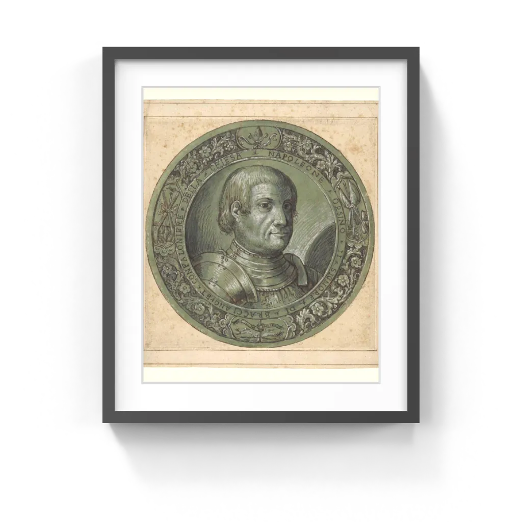 Attributed to Bernardino Capitelli (Italian, 1589–1639) A portrait of the soldier and nobleman Napoleone Orsini II fills the center of this tondo, while his name and titles wrap around the edge of the scene. Obviously proud of his soldierly accomplishments, Orsini appears in his armor. Interspersed among the foliage around the border, the unknown artist also included various military regalia such as rifles, flags, and a banner inscribed in Latin In hostes--perhaps the Orsini family motto.