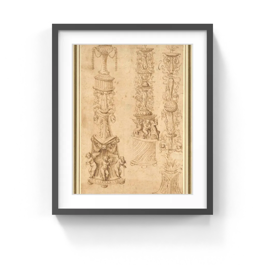 Artists designed such intricate candelabra not just as functional objects like candle or torch supports; they also appeared as decorative motifs. Such forms ornamented the margins of printed books and filled the edges of frescoes. Parallel hatched lines down the sides of each candelabrum in this drawing give each form a sense of depth. But the clarity of the lines also suggests that the drawings could have transferred for engravings. Pattern books containing prints organized by their ornamental themes became popular in the Renaissance, when craftsmen used these books to create ornaments in a variety of media.