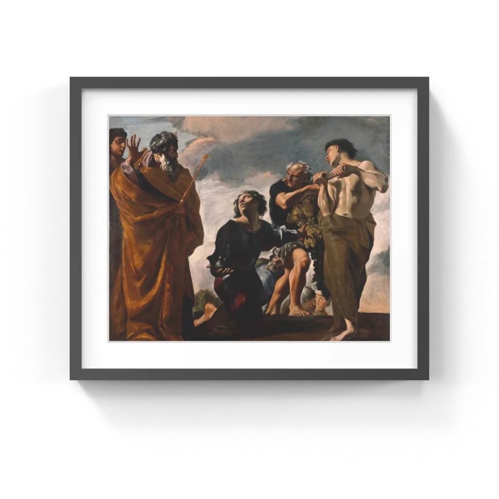 In the Old Testament (Numbers 13:1–27), Moses sent spies to Canaan—the Promised Land—to determine whether the land bore fruit. Lanfranco depicted these spies as they returned, laden with grapes, pomegranates, and figs as signs of the plenty of Canaan. Laying the ample harvest at Moses' feet, they reported, “surely it floweth with milk and honey.” In Catholic theology, the plentiful grapes of the Promised Land prefigured the wine of Communion, making it an appropriate subject for the large Sacrament Chapel. A second example from this series dedicated to Eucharistic themes exists in the Getty’s collection; Elijah Receiving Bread from the Widow of Zarephath.