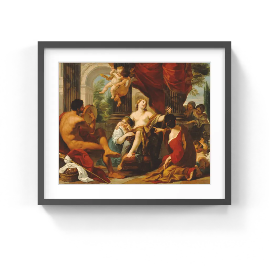 In Luigi Garzi's mythological picture, ancient architecture mingles with contemporary clothing of the early 1700s. Despite the splendor of the architecture, Garzi achieved an intimate effect, partly through the many anecdotal elements: women lean in over the wall, a child plays with a tiny dog, and putti frolic to the music of Hercules's tambourine. Garzi successfully combined these light-hearted elements, typical of the Rococo, with High Baroque's physicality and grandness of gesture.