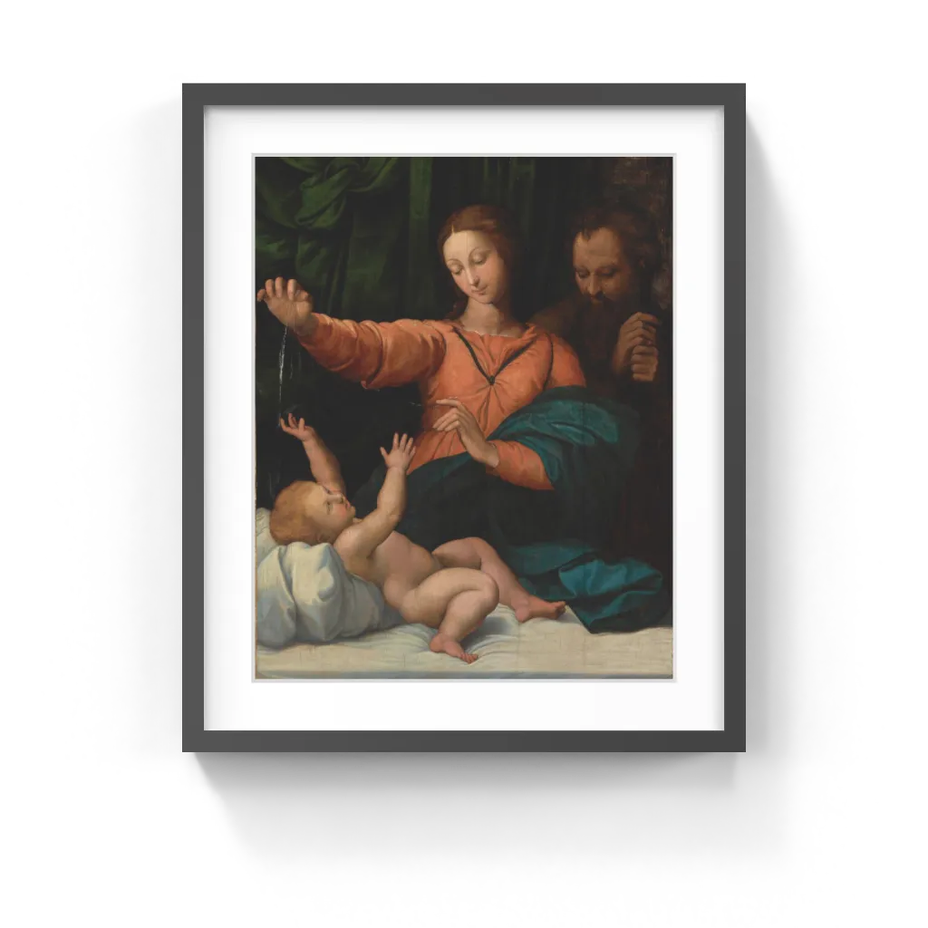 Copy after Raphael (Raffaello Sanzio) (Italian, 1483–1520) The infant Christ Child reclines on pillows while the Virgin Mary lovingly gazes down at him. She holds a transparent veil in her hands toward which the child playfully extends his hands. In the shadows behind the Virgin, Joseph watches the happy scene. This intimate and touching view of the Holy Family exemplifies the Renaissance fascination with Jesus's humanity. The Virgin's beauty and youth, the child's pudgy body, and their warm smiles enhance the sense of the Holy Family as ordinary, loving, and ultimately very human.