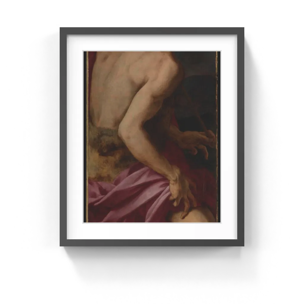 Bronzino depicts Saint John the Baptist's muscular figure in a restricted space, his torso twisted to accommodate the panel’s vertical format which creates a series of strong diagonal accents, zigzagging the length of the painting. This artificial, serpentine pose marks Bronzino’s move away from naturalism toward a more abstract elongation of forms and more stylized figures, a shift which occurred in the 1540s.