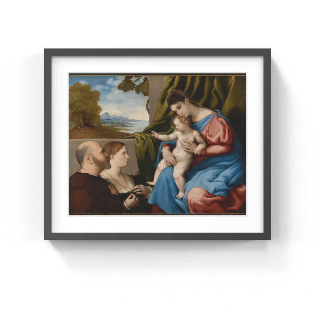 Donors were frequently portrayed in paintings that they commissioned from the Medieval period onwards. This specific kind of composition, in which kneeling donors are depicted in profile alongside the Virgin and Child was developed by a fellow Venetian artist, Giovanni Bellini (about 1435 – 1516), in the 1490s, and became increasingly popular in the early 1500s. While earlier donor portraits were typically altarpieces, by the fifteenth century such paintings were also commissioned to display in the home or for private chapels. These works served both as portraits of the individuals who funded them, and as testimony to their piety.