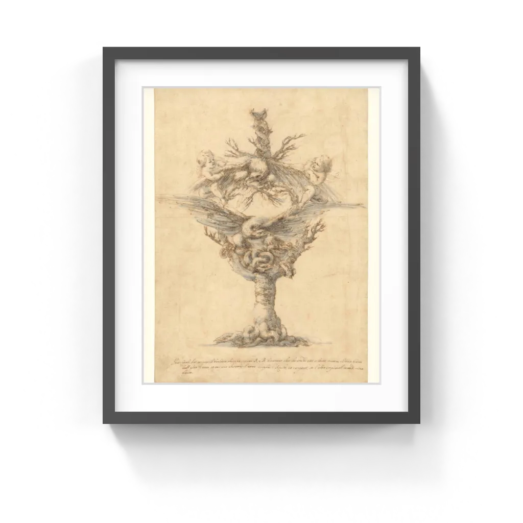 Stefano della Bella (Italian, 1610–1664) On top of a gnarled tree, an eagle stands with outstretched wings. With its claws, the imposing bird attacks a coiled serpent. Two putti pull at the wings of a second eagle that carries a pair of entwined spouts on its back. This fanciful scene is a design for a glass cup and is explained in the inscription at the bottom of the sheet: white wine should be poured into one tube and red wine into the other, so that the red wine fills the eagles and snakes, and the white wine fills the rest.