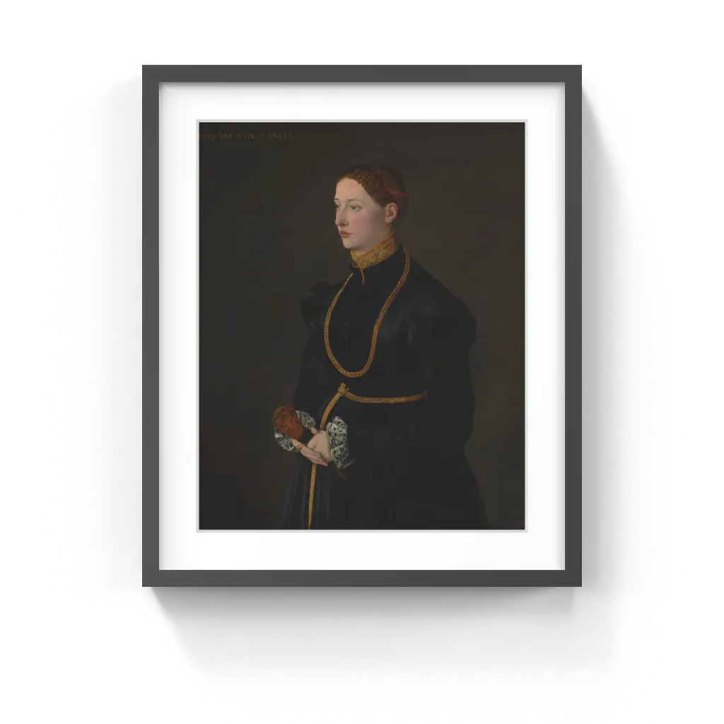 Barbara’s sober and subtly ornamented black gown serves as a magnificent foil for accoutrements which convey her wealth and social standing: the embroidered collar, blackwork cuffs, heavy gold chain, and the long gold girdle around her waist. The soft leather gloves she gently clasps, decorated with flowers may, along with the rings on her forefinger and the girdle, refer to her marriage. While Barbara Kressin has been associated with the Nuremberg family of the same name, her identity cannot be confirmed. The naturalism of the sitter’s face and hands, together with the close attention to the details of costume, suggest the as-yet unidentified artist hails from the Netherlands.