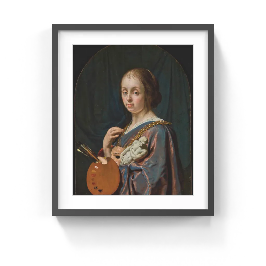 Frans van Mieris the Elder (Dutch, 1635–1681) Images depicting the allegory of art were traditionally used to classify painting as one of the liberal arts. A woman, usually idealized, personifies Pictura (Painting) and holds objects vital to artistic creation. In her left hand she holds a palette, brushes, and a small plaster sculpture that served as a model for larger works. Around her neck she wears a mask on a chain, which may refer to art's ability to deceive through the art of illusion.