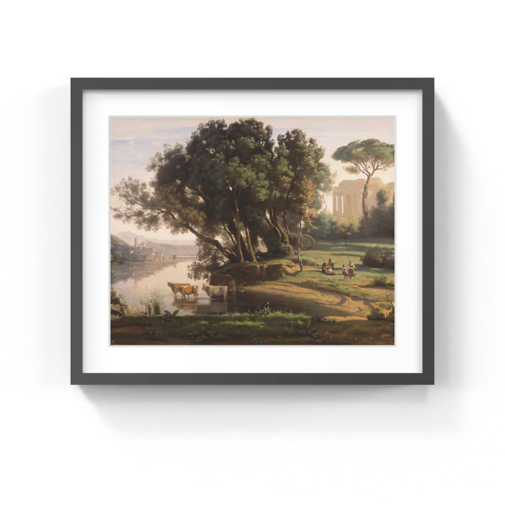 The golden morning light bathes this landscape of singing and dancing peasants with antique ruins in the background. To the left, picturesque cows wade in the reflective water, and a contemporary townscape appears in the distance. Like Lorrain, Corot presented a utopian setting in which ancient and modern culture coexist in lyrical harmony.