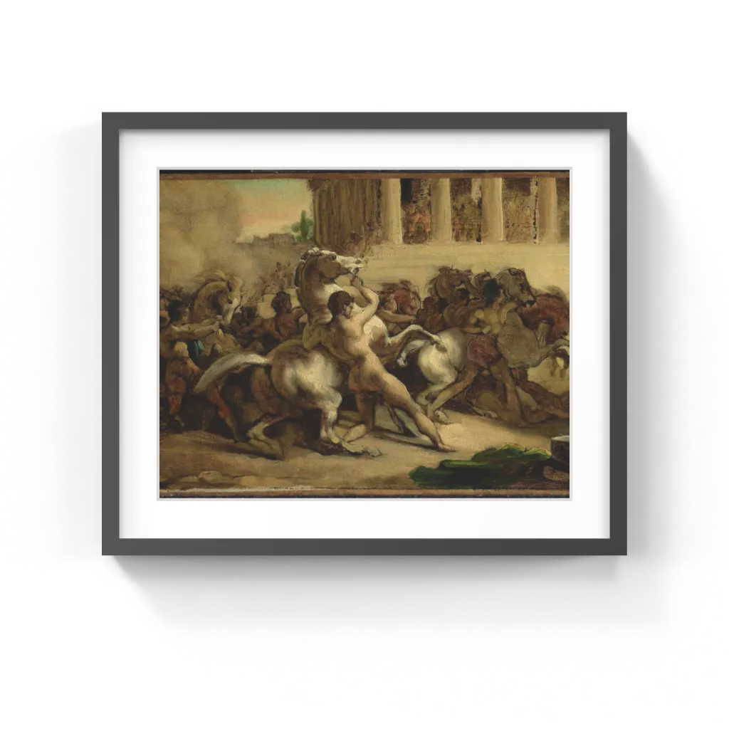 Théodore Géricault (French, 1791–1824) As a boy, Théodore Géricault loved drawing horses and would sit in the stables watching and sketching. In 1817, he traveled to Rome where he witnessed the annual Carnival horse race and subsequently made numerous studies of this spectacle. This study marks the moment just before the race begins, when the terrified riderless horses begin their run down the Corso in Rome.