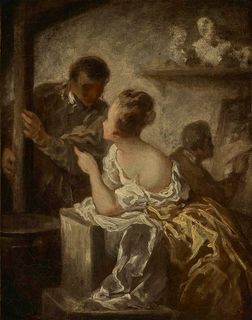 Struck by the expressive power of Fragonard's rapid brushstroke, Daumier paid homage to his predecessor in a series of paintings that included The Studio. Daumier, who almost never portrayed beautiful women as objects of attraction, succumbed to Fragonard's sensuality and endowed this model with the upswept hair and casual off-the-shoulder costume of Fragonard's females. Emulating Fragonard's manner of sketching on canvas, Daumier made her dress shimmer, drawing with his brush to build the lights cascading from her blouse onto her full skirt.