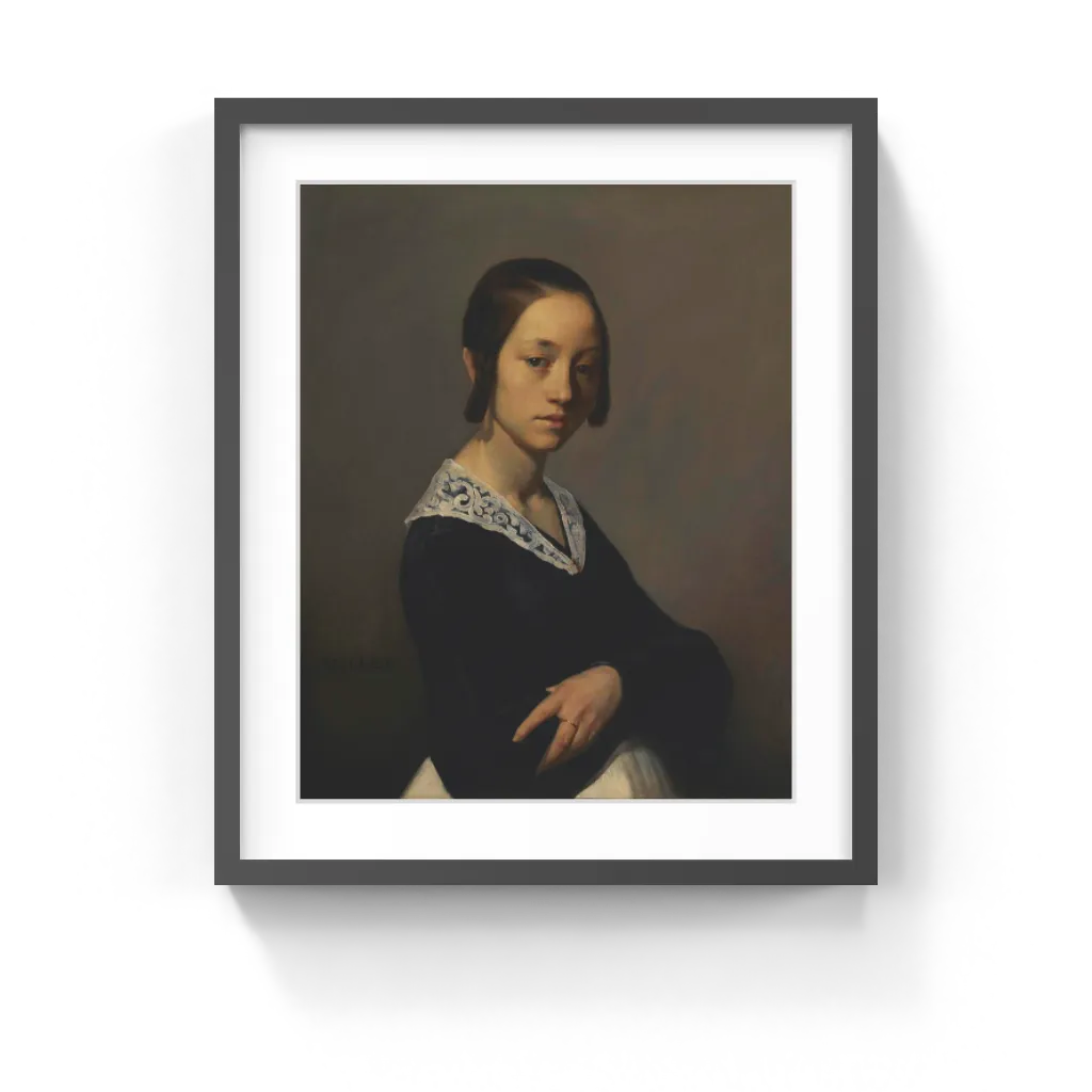 Jean-François Millet (French, 1814–1875) Before Jean-François Millet achieved international success as a painter of peasant life, he earned his early living as a portraitist. Here, he depicted Louise-Antoinette Feuardent, the wife of his lifelong friend Félix-Bienaimé Feuardent, a clerk in the library at Cherbourg. In this portrait painted shortly after her marriage, Louise-Antoinette prominently displays her wedding band on her left hand. In a style reminiscent of seventeenth-century Dutch painters, Millet painted the modestly dressed sitter against a plain background using a limited palette. Louise-Antoinette looks out of the picture, her brown eyes calmly assessing the viewer. Through a tightly controlled composition and a careful balance of monochromatic tones, Millet captured Louise-Antoinette's self-containment, reserve, and poised composure.