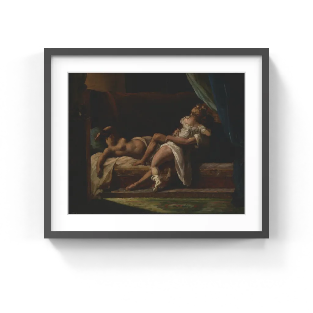 Théodore Géricault (French, 1791–1824) Théodore Géricault's only known erotic painting, this small oil sketch depicts two lovers locked in a passionate embrace while their languid companion calmly watches from the left. The woman's nudity and relaxed pose evoke the classical tradition of representing repose after lovemaking, a tradition that is also evoked by the way her voluptuous figure complements the statue of Venus above. Encoiled in her lover's arms and with her legs provocatively exposed, the woman in white is an active participant in the amorous act rather than a passive object. With a modern directness, Géricault captured the intensity and energy of human sexuality in a manner very different from the idealizing conventions of his age.