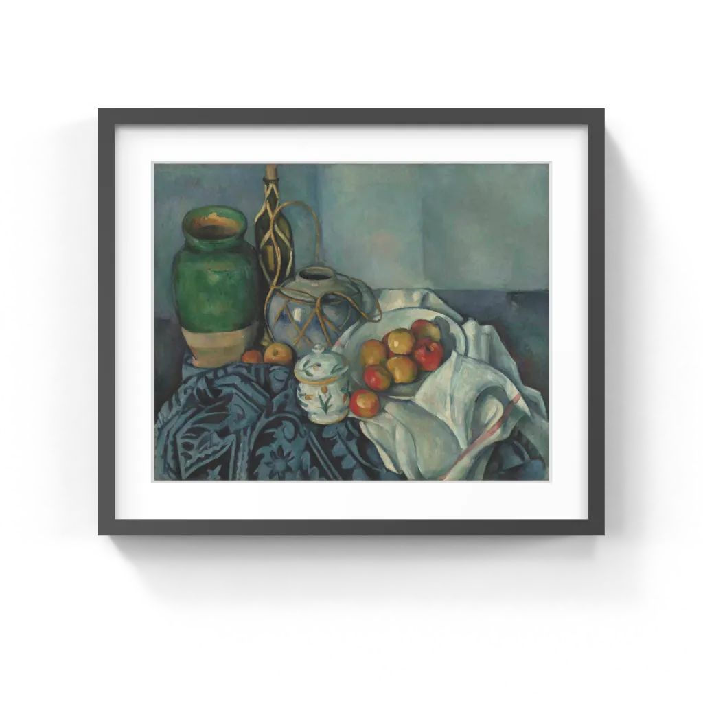 Paul Cézanne (French, 1839–1906) During the last thirty years of his life, Paul Cézanne painted the same objects--the green vase, the rum bottle, the ginger pot, and the apples--over and over again. His interest was not in the objects themselves but in using them to experiment with shape, color, and lighting. He arranged his still lifes so that everything locked together. Edges of objects run into each other; for example, a black arabesque seemingly escapes from the blue cloth to capture an apple in the center; the sinuous curves of the blue ginger pot's rattan straps merge with other straps on the body of the bottle behind. Giving form and mass to objects through the juxtaposition of brushstrokes and carefully balanced colors and textures, he gave the painting a sense of comforting stability.