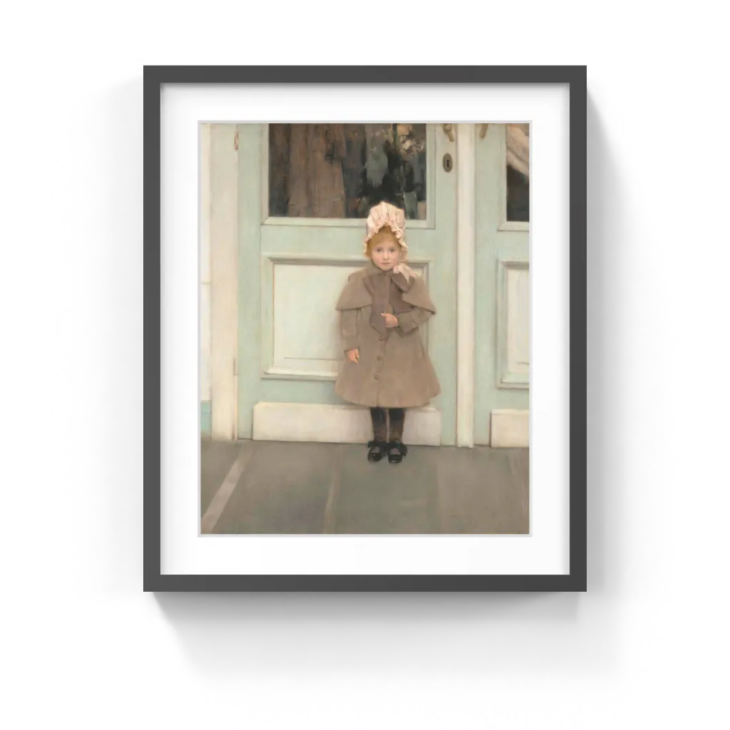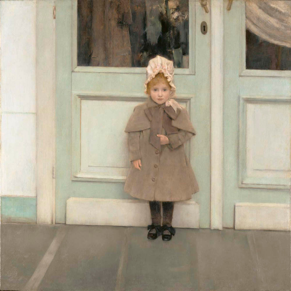 Fernand Khnopff (Belgian, 1858–1921) Fernand Khnopff depicted the daughter of a composer friend on a porch before a closed door, with her tiny thumb catching the edge of her bow as she reaches into her coat. With this small gesture, Khnopff captured the child's vulnerability and uncertainty in facing the outside world. To further evoke a child's perception of a world scaled for grown-ups, he framed Jeanne Kéfer's tiny body against the adult-sized door and tilted the floor ever so slightly.