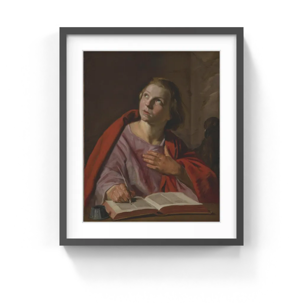 Frans Hals (Dutch, 1582/1583–1666) Observed by his symbol, the eagle, and poised to write God's words, Saint John looks up for divine inspiration, which he receives as brilliant light. Saint John, the Galilean fisherman who became one of Christ's apostles, is traditionally considered the author of the Gospel according to John and of the Bible's Book of Revelation. Hals used only light and handling of paint to create the lifelike, fleeting quality that made his portraits so prized. He chose a dramatic moment, then captured it with bold, spontaneous brushwork. A contemporary reported that Hals called the final touches he made to his canvases "putting in his handwriting"--adding the trademark highlights that give his pictures much of their sparkle.