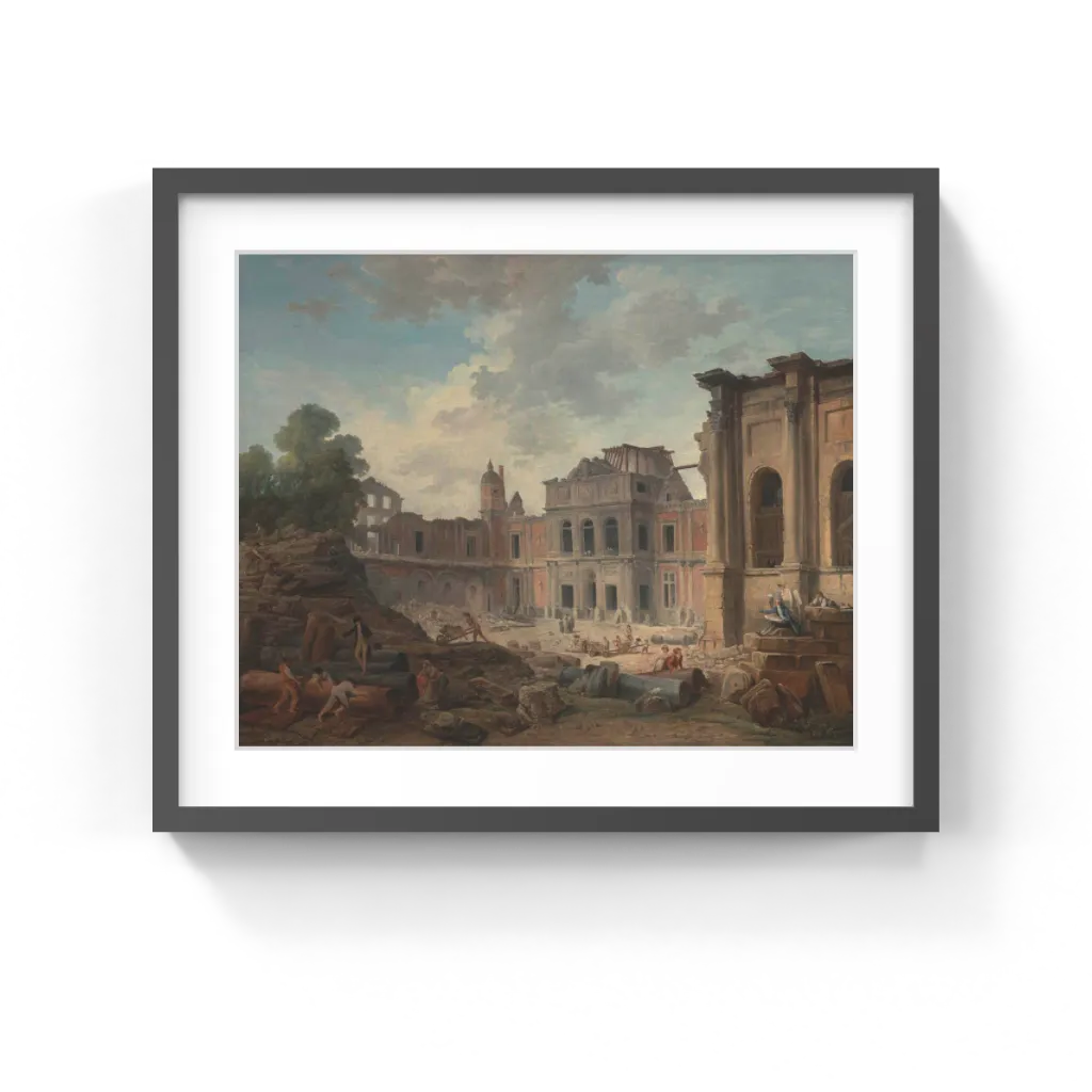 Hubert Robert (French, 1733–1808) Under a bright, sun-drenched sky, the demolition of the château of Meudon is well under way. In the lower left, a man in a top hat directs four laborers—one clearly shirking his responsibilities. Other workmen transport stones with wheelbarrows or by hand. At center, two women and a young girl admire the ruins. Other visitors have entered the structure and gaze out from a balcony. Another young woman, holding a baby, tends to a group of children playfully lugging a cart across the littered courtyard. At the right edge, an artist with a large sheet of paper on his lap gestures at the scene below.