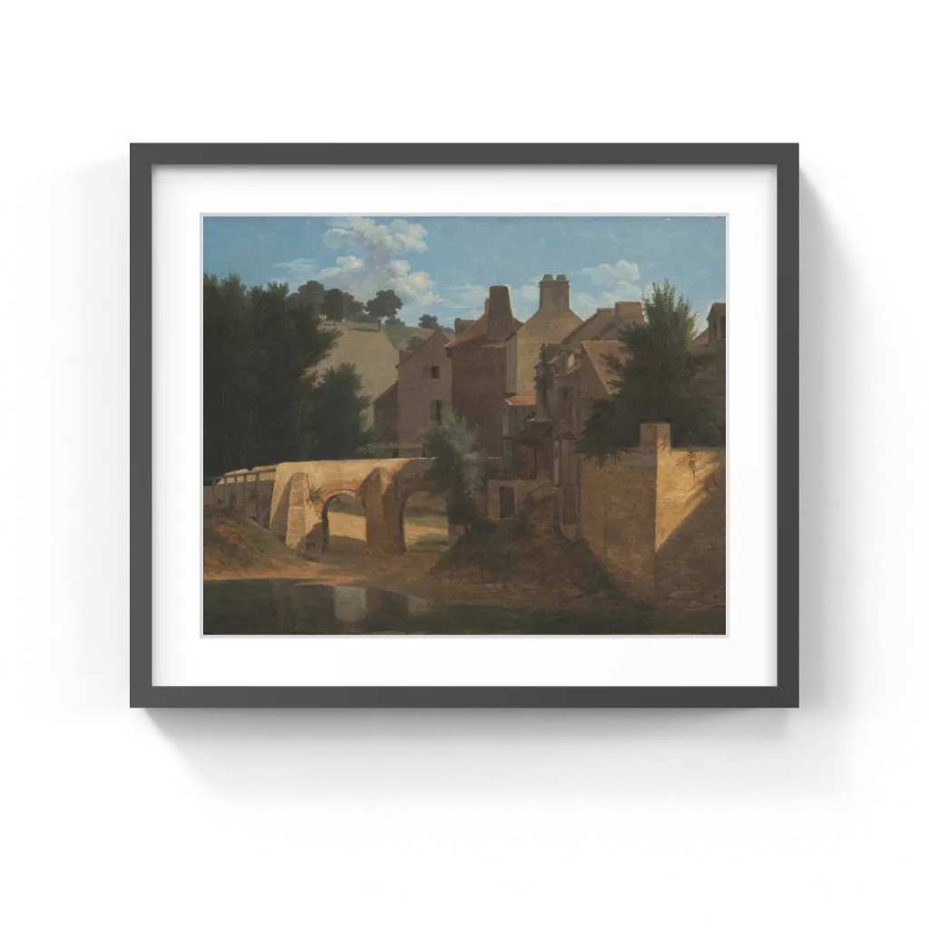 plein air (made outdoors) oil sketch by Jean-Victor Bertin captures the graceful curve of a sunlit bridge on the outskirts of a French village in the early 1800s. A steep hillside ridge in the distance echoes this line of light tracing the roadway, dividing the image into thirds. At the painting's center, horizontal shapes meet vertical ones, created by the upward thrust of village dwellings. Interestingly, the artist's careful observation of light both enhances and obscures this obsession with geometry. Late afternoon sun throws most of the scene's natural and manmade subjects into shadow, with surprising punctuations of color and light in the sky and foreground.