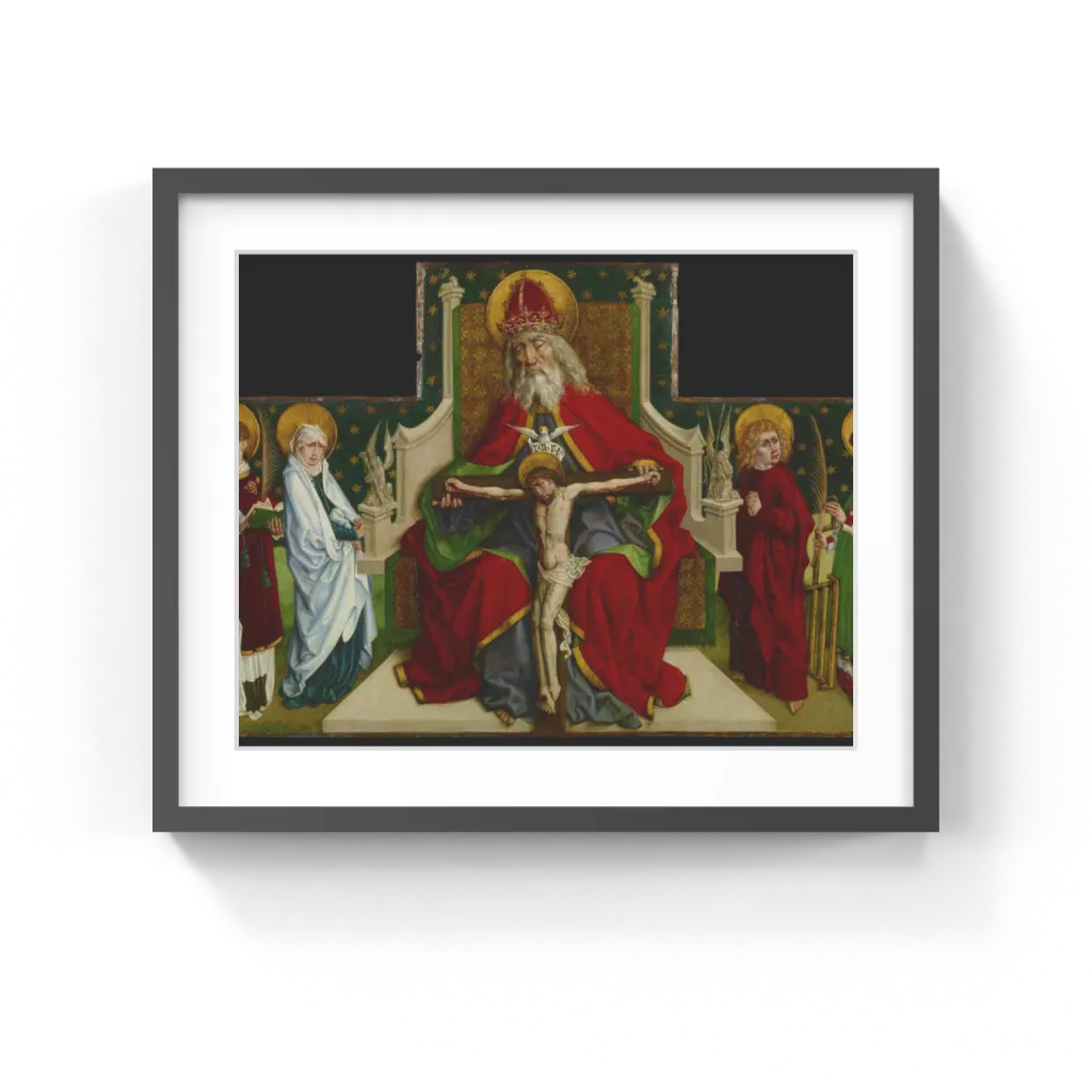 The Peter Hemmel von Andlau Workshop (German, about 1420/1425–after 1501) God the Father sits enthroned, holding the crucified Christ with the Holy Spirit between them, all three dominating the composition. Together they represent the Trinity, the central doctrine of the Christian faith, in which all three are united as one. This recently discovered altarpiece was carefully designed for the kneeling donor, a cleric, and expresses his desire for penance. The donor's plea for salvation inscribed on the scroll cleverly incorporates the date "1479" in Roman numerals. Saint Stephen stands protectively over him, bearing the stones of martyrdom on his head.