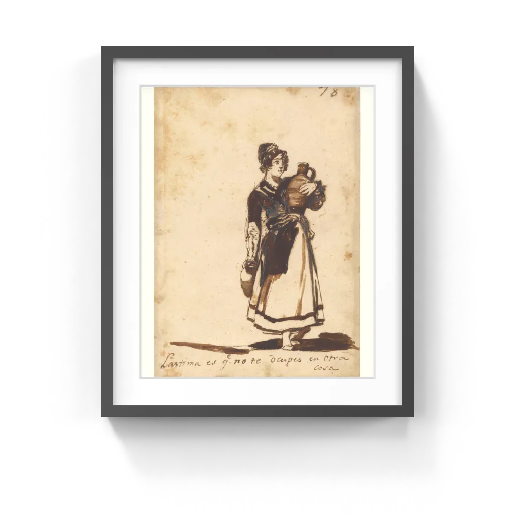 Francisco José de Goya y Lucientes (Francisco de Goya) (Spanish, 1746–1828) Throughout his work, Francisco José de Goya y Lucientes expressed himself freely and often with humor. This page from his "Album C" seems, at first glance, to be one of his depictions of working girls. This young woman, however, wears a fine dress, jewelry, and a rather coy hairstyle and displays a graceful, almost cultivated bearing. She is pretty, not vacuous, but her questioning gaze and awkward cradling of the jug betray her uncertainty. Goya's caption, the drawing's title, tells the whole story: He admonishes her for playing at being a peasant, a practice then fashionable among the upper classes. Even as he rebuked this young woman, he flattered her, setting her alone and off-center on the sheet with a few pen strokes and a bit of wash to give her grounding. At least seventy years old when he made this drawing, Goya remained fluid and spontaneous in his technique, quickly capturing the swaying of her skirt and the little crinkles in her sleeve.