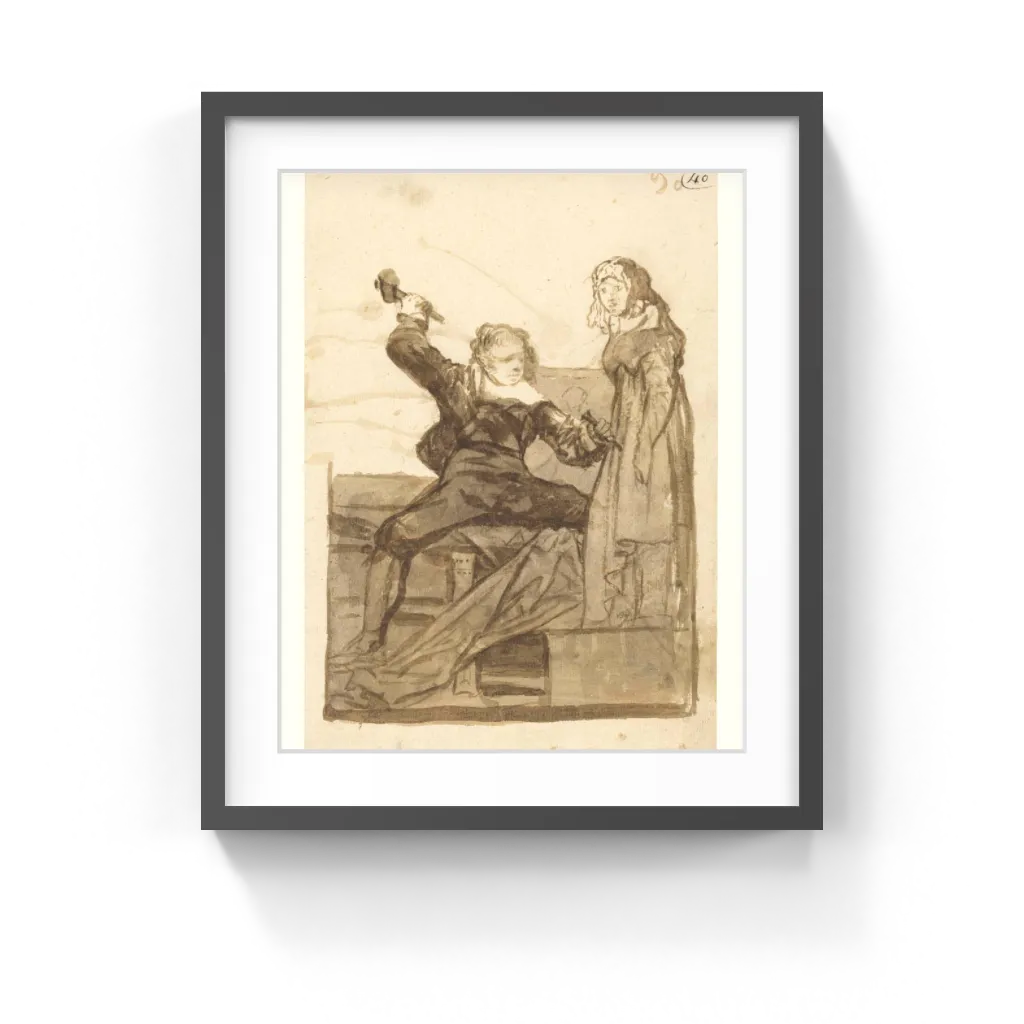 In a possible self-portrait, Goya depicted Pygmalion with his legs spread wide, readying himself to take a mighty swing at the chisel, which is aimed at Galatea's crotch. Leaning slightly forward, she looks out with a fearful expression. Goya's animated interpretation of the well-known myth is highly original and even mocking. Free application of sepia wash shows Goya's complete command of the range of tones available in this medium.